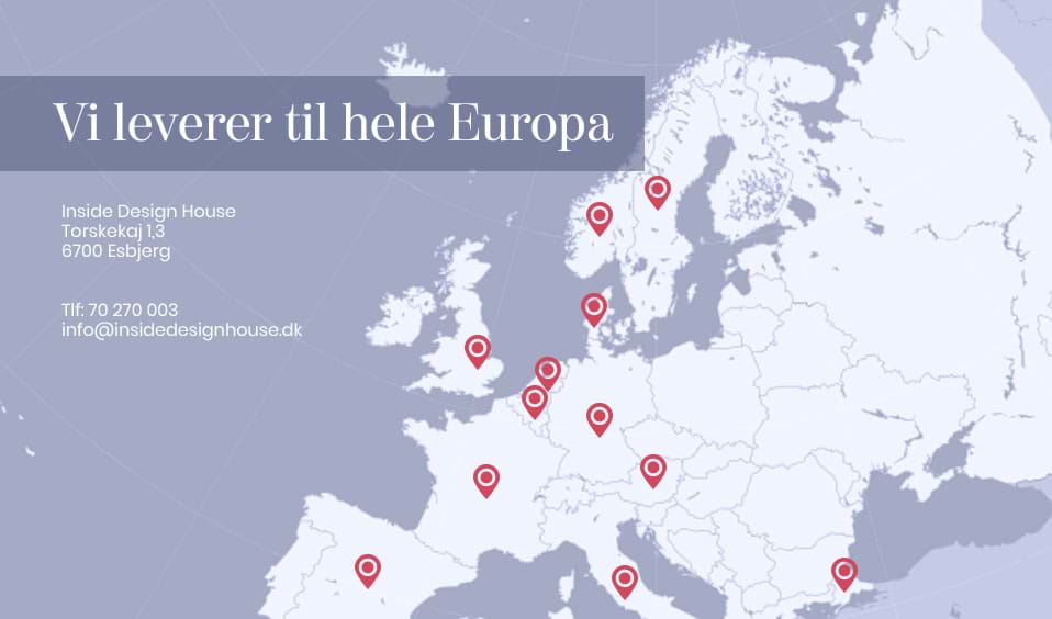 Inside Design House ApS. Hovedkvarteret ligger på Torskekaj 1 i hjertet af Esbjerg. Vores arbejde tager os dog overalt i Europa, og vi kommer også gerne til dig. Vi er en virksomhed i vækst, og har lige modtaget kreditværdigheden AA+. Har du spørgsmål, eller et ønske om at vi skal hjælpe med indretning eller indkøb af møbler, så tag endelig fat i os på telefon: +45 70270003. Vi glæder os til at høre fra dig.
